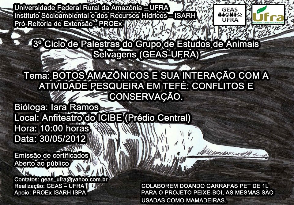 Fiquem atentos aos eventos do Grupo, Dia 30-05-2012 às 10:00h no predio central da UFRA será realizado mais uma palestra do 3º Ciclo de Palestras do GEAS, com o tema: "Botos Amazônicos e sua Interação com a Atividade Pesqueira em Tefé: Conflitos e Consevação", Com a Bióloga Iara Ramos.